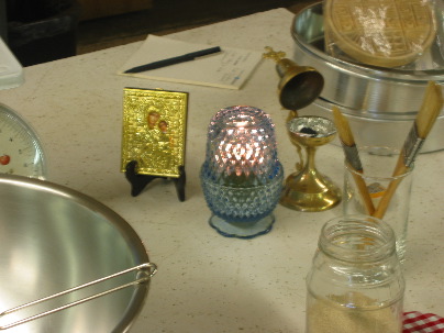 Make the sign of the cross over the flour mixture with the incense and report the Lord’s Prayer. Place clean board on top of stove (no heat).